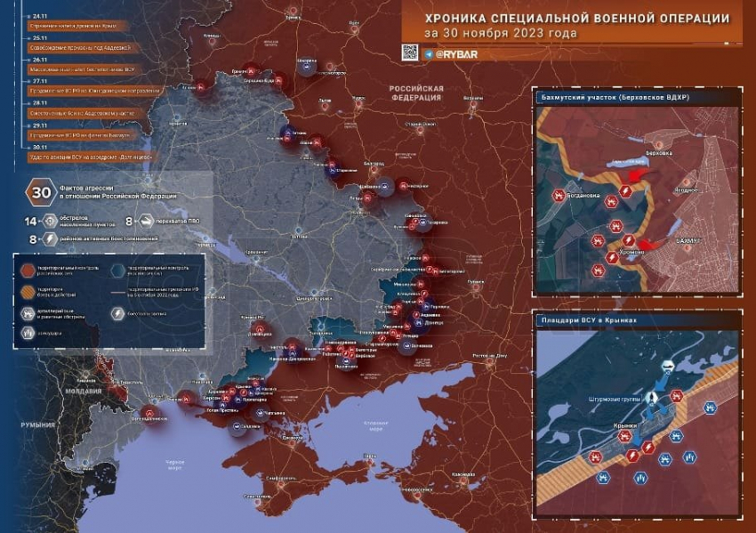 Карта боевых действий на Украине по данным на 05:00 мск от 1 декабря 2023 года